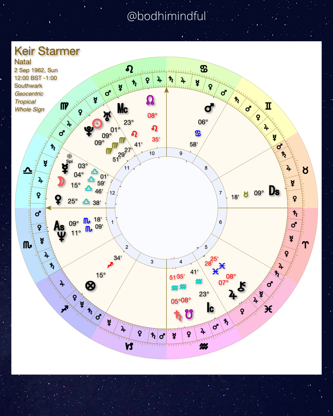 If we apply this in the case of Starmer, could it be that his pursuit of being a leader, of being on centre-stage (North Node in Leo) is being challenged by this double-tap (Saturn & South Node) that requires a rejection of an existence centred on material whims?